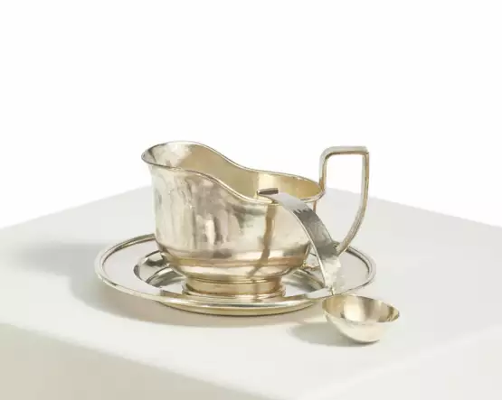 Lot 736 | SILVER SAUCE BOAT WITH SPOON AND ROUND STAND