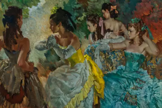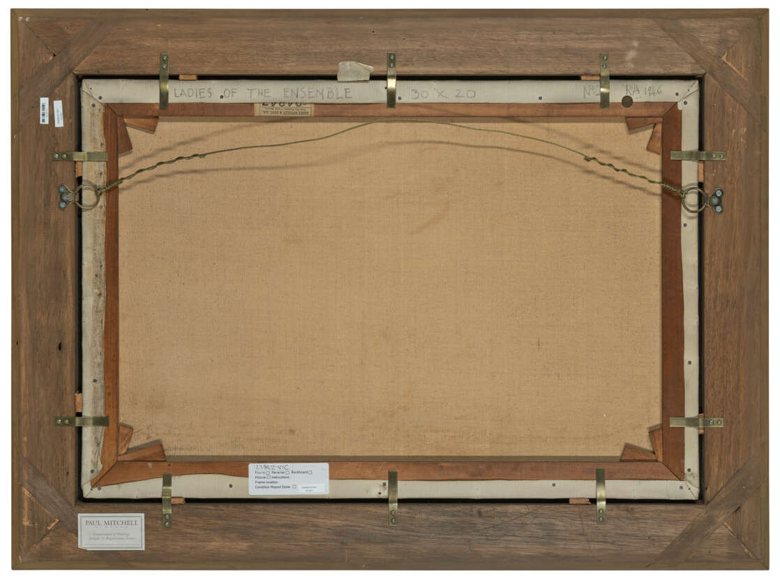 signed 'W. RUSSELL FLINT' (lower right), inscribed 'LADIES OF THE ENSEMBLE' (on the reverse) and further signed and inscribed 'Ladies of the ensemble oil W Russel Flint' (on the stretcher).