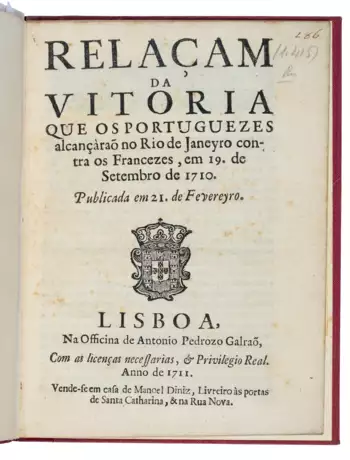 2. [MENEZES, Francisco Xavier, 4th Count of Ericeira (1673-1743)]. Relaçam da vitoria que os Portuguezes alcançaraõ no Rio de Janeyro contra is Francezes, em 19. De Setembro de 1710. Lisbon: Antonio Pedrozo Galraõ for Manoel Diniz, 1711.
