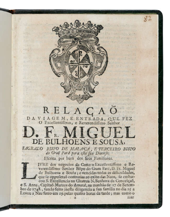 Recounts Miguel de Bulhoens e Sousa’s journey to Brazil having been appointed coadjutor bishop of Pará after serving as Bishop of Malacca. The title-page features a large woodcut of the arms of the Dominican Order. Bibliotheca Brasiliana, pp. 466–67.