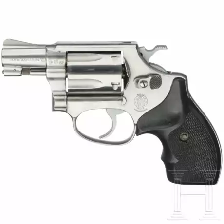 Cal. .38Special, SN. R77938, blanker Lauf, Länge 2". Fünfschüssig. Dt. Beschuss. Fertigung komplett in poliertem Stainless. Gummigriffschalen. Nach Reinigung neue Erhaltung.