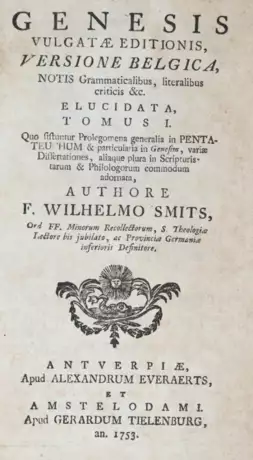 Paralleltext lat.-flämisch. - Herausgeber und Spiritus rector dieser reich kommentierten zweisprachigen Bibelausgabe mit neuer Übersetzung war der Franziskaner und "belgische Hieronymus" Wilhelm Smits (1704-1770), der auch das Antwerpener "Musaeum philologicum Biblicum" gegründet hatte. Die Bände erschienen in ungeordneter Folge unter ihrem Einzeltitel. Die Ausgabe blieb unvollendet. - Selten, nicht bei Darlow-M. - Vorhanden: Liber Exodi I, II u. III; Ecclesiasticus; Liber Geneseos I, II/1 u. II/2; Proverbia (angebunden: Ecclesiastes; Canticum canticorum); Sapientia; Psalterium; Tobiae (angebunden: Judith; Esther). - Gebrauchsspuren.