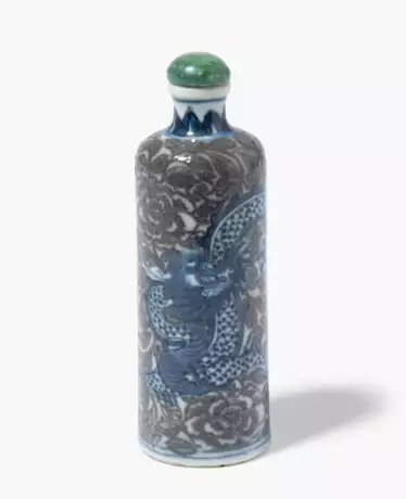 China, Qing-Dynastie. Porzellan. Zylinderform. Unterglasurblauer Drachendekor auf leicht rosafarbenem Hintergrund mit Päonienblumen. H 9 cm.