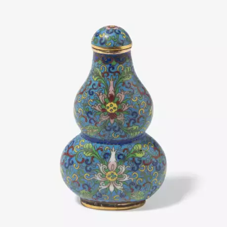 China, Qing-Dynastie. Email cloisonné. Am Boden Qianlong-Vierzeichen-Siegelmarke. Kalebassenform. Polychromer Lotusblumenrankendekor auf türkisblauem Grund. H 7 cm.
