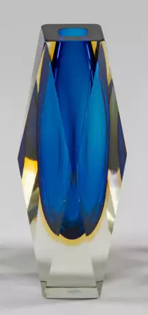 Dickwandiges, farbloses Kristallglas mit gelbem und blauem Unterfang. Entw. Flavio Poli, 1970-1979. H. 29 cm.