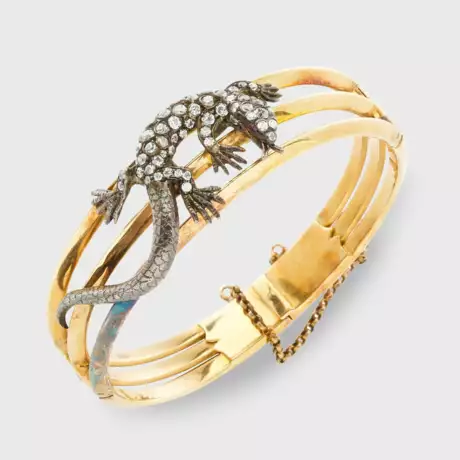 Gelbgold, 14 k. Plastisch gestaltete Eidechse besetzt mit Altschliffdiamanten von zus. ca. 1,30 ct.; Gew. ca. 29,55 g.