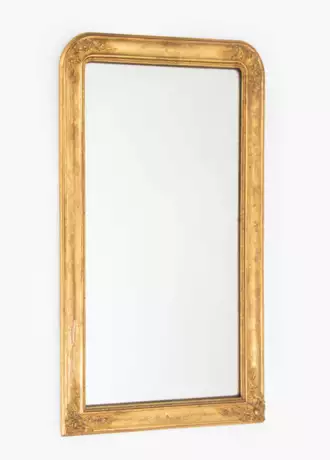 Mitte 19.Jh. Louis Philippe. Rechteckiger, profilierter Rahmen mit oben abgerundeten Ecken. Gravierte und reliefierte Ornamentik. Auf rotem Poliment vergoldet. Ergänztes Spiegelglas. 80 x H 136 cm.