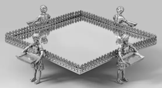 Zinn, plated. Als Füße für den kronenartig umzäumten Rahmen eines quadratischen Spiegeltabletts, vier vollplastisch ausgearbeitete Knabenfiguren mit Turban und Pluderhose, vor sich Tabletts tragend. Minim. gerissen/rest.; Gem. "Figura Piero per Atena", "Etain 95%". H. 18,5 cm. 56 cm x 56 cm.