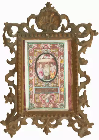 Wohl Nordfrankreich, 18.Jh. Pergament geschnitten, partiell gouachiert und in Goldbronze gehöht. Ovale, ausgeschnittene Miniatur über Marienglas (Glimmer). Das Kind in der Krippe, flankiert von Maria und Joseph. Geschnittene Inschrift "NATIVITAS JESU / CHRISTI" mit Marienglas unterlegt. Feinster Ästchen- und Netzmaschenschnitt mit Blüten, die mit Goldrosetten beklebt sind. Mit feiner Gaze hinterlegt. 12,5x7 cm (Schnitt). Auf Stoffunterlage in Rokoko-Rähmchen. H 27 cm. Kleine Schad- und Reparaturstellen, später goldbronziert.