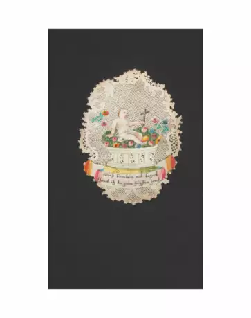Süddeutsch, 18.Jh. Pergament geschnitten, gestichelt und genadelt, partiell gouachiert, tlw. in Goldbronze gehöht. Im Zentrum der Kartusche auf Blumenkorb liegendes Jesuskind mit Kreuz. Schriftband: "Diess blimlein mit begird / schönck ich dir zum Höchsten ziert". Feinster Netzmaschenschnitt mit Rocaillen, Quadrillagen und Streublumen. 10x6,5 cm. Ungerahmt.