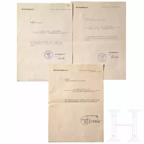 Jeweils DIN A4, mit gedrucktem Kopf "Der Reichsführer-SS" über blindgeprägtem Hoheitsadler und mit Tintenstempel "Der Reichsführer-SS". Ernennung zum SS-Obersturmführer mit Wirkung zum 1.8.40 für den Untersturmführer in der 2. San. Komp. SS-VT, OU des Leiters des SS-Personalamtes Gruppenführer Walter Schmitt. Zum SS-Hauptsturmführer im SS-Lazarett Wien mit Wirkung zum 4.1.42, erneute OU sowie Paraphe Walter Schmitts. Zum SS-Sturmbannführer der Reserve der Waffen-SS, datiert "Feld-Kommandostelle, den 9. November 1943" (mit gleicher Wirkung), OU in Tinte "H. Himmler" sowie Paraphe des Gruppenführers Maximilian von Herff. Jeweils gefaltet, teils leicht fleckig.