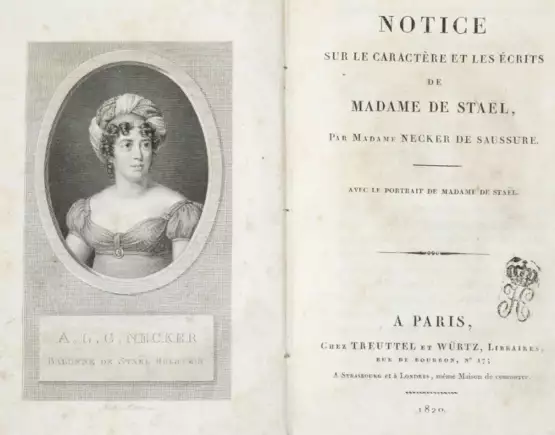 Dabei: Stael-Holstein,(A.L.G.)de. De l'influence des passions sur le bonheur des individus et des nations. Paris, Maradan 1818. 1 Bl., 2 S., 1 Bl., 380 S. Ldr. d. Zt. mit Rverg. u. Rsch. (Tls. beschabt, berieben u. bestoßen, unt. Kap. u. Ecken etw. läd.). - Vgl. Brunet VI, 3799. Slg. Borst 771 (EA von 1796). - Diess. Delphine. 1803. - Stael-Holstein,A.(L.)de. Notice sur M. Necker. Paris, Treuttel et Würtz 1820. 3 Bl., 351 röm. num. S. Hldr. d. Zt. - Wohl erste Ausgabe dieser Biographie, verfasst vom Enkel des berühmten Staatsmannes.