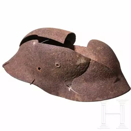 Die Helmglocke ist stark verformt und beschädigt, das Helmabzeichen (Runen) ist noch gut erhalten, das Befestigungsband für das Innenfutter ist vorhanden, so auch ein kleines Stück vom Kinnriemen, am Rand sind vier umgebogene Nägel angebracht, wahrscheinlich zum Befestigen von Tarnmaterial. Alters- und Gebrauchsspuren sowie stärkere Korrosion.