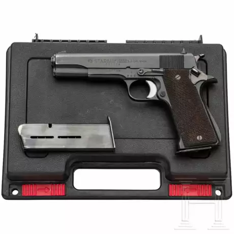 Cal. 9mmBergmBayard, SN. 473122, leicht rauer Lauf, Länge 130 mm. Achtschüssig. Beschuss "C1" = 1957". Kontrastvisier. Ladeanzeiger. Links am Schlitten Firmierung mit Kaliber, rechts "MODELO SUPER", am Knauf "Super". Vollständige, originale Brünierung. Auszieher gelb angelassen. Hahn buntgehärtet. Dunkelbraune Holzgriffschalen mit Fischhaut. Magazin und Ersatzmagazin in Kunststoffbox.