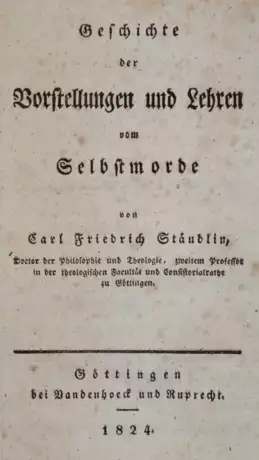 Rost, Bibliogr. des Selbstmords, 90. Waller 15006. Erste Ausgabe. - Der protestantische Theologe Karl Friedrich Stäudlin (1826-1781) war der Bruder des Dichters und Förderers von Hölderlin, Gotthold Friedrich Stäudlin (1758-1796), "einer der gelehrten Schwaben, der aber seine Lebensarbeit in Tübingen that ..." (ADB XXXV, 516-519). - "Der Selbstmord hat im religiösen Bewußtsein der Menschheit von jeher seine Beurteilung erfahren... unter den älteren Werken verdient das Buch von Stäudlin besondere Beachtung" (Rost). - Gebräunt und etw. fleckig.