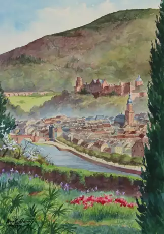 Ansicht mit dem Schloss li, die Stadt u. der Neckar rechts. - Am Nepomukstandbild. - Das Schloss gesehen von der Hirschgasse. - Altstadthäuser u. Schloss. - Blick vom Philosophenweg. - Morgensonne über Altstadt u. Schloss.