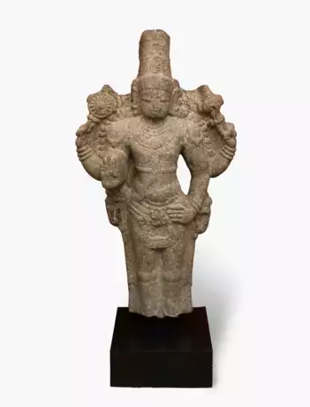 Indien, 12.Jh, Chola Periode. Granit. Stehende Gottheit mit hoher Krone, die rechte Hand erhoben. Um ihn herum seine Attribute. H 122 cm.