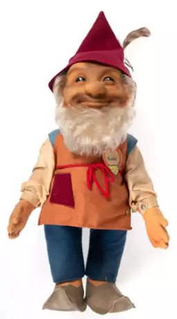 Lot 587 | Steiff-Figur "Zwerg Gucki", 1950er Jahre, auf Schürze Steiff-Knopf, Brustschild mit Namen, Gummikopf und Stoffkörper, H. (ohne Mütze) 29 cm
