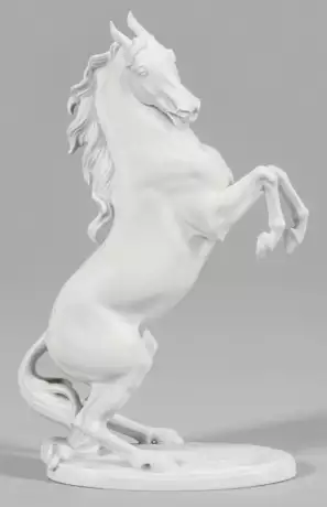 Weißporzellan. Auf ovalem Sockel die naturalistische Darstellung eines steigenden, sich aufbäumenden Arabers mit sichtbaren Muskeln und Sehnen. Entw. Adolf Röhring. Bez.; Modell-Nr. 95. Minim. rest.; Gepresste Manufakturmarke. H. 30 cm.