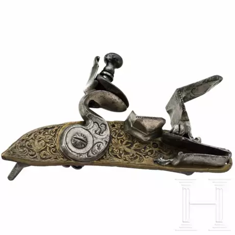 Fein floral und figürlich gravierte, mit Messing plattierte Schlossplatte. Hahn, Hahnlippe und Batterie ebenfalls fein graviert. Hahnfeder etwas schwach, Batterieschraube ersetzt. Länge 15 cm.