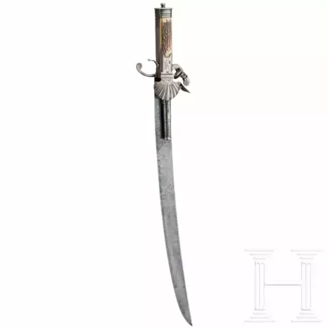 Gebogene Rückenklinge, leicht rostnarbig. Terzseitig verbundener Schlosskasten mit rechtsseitig graviertem Trophäenbündel. Oktagonaler, in polygonal und danach in rund übergehender Lauf mit Balustern und kanonierter Mündung. Achtfach gezogene Seele im Kaliber 11 mm. Unter der Kammer Birminghamer Abnahmemarken und "LW". Eiserne Parierstange mit muschelförmigem Stichblatt und Griffschalen aus Hirschhorn. Knaufkappe aus Eisen. Länge 63,5 cm.