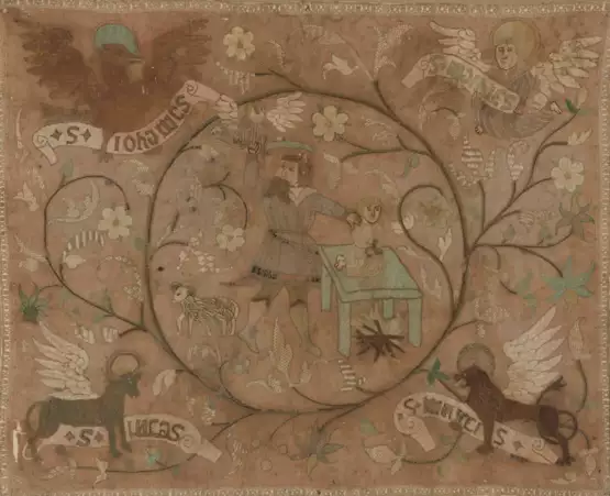 Schweiz, um 1600. Wohl Mittelstück einer Altardecke. Farbige Seiden- und Metallfadenstickerei auf Leinen. Zentral von Blumenranken gebildetes Medaillon. Darstellung Abrahams, der im Begriff ist, seinen Sohn Isaak zu opfern. Ein Engel des Herrn hält ihn ab. In den Zwickeln die geflügelten Evangelisten-Symbole mit Schriftbändern. (Später?) monogrammiert "W U" (unten links bzw. rechts). Ornamentale Bordüre. Ca. 59x73 cm. Holzrahmen ergänzt. Kleine Schad- und Fehlstellen. 65x75,5 cm.