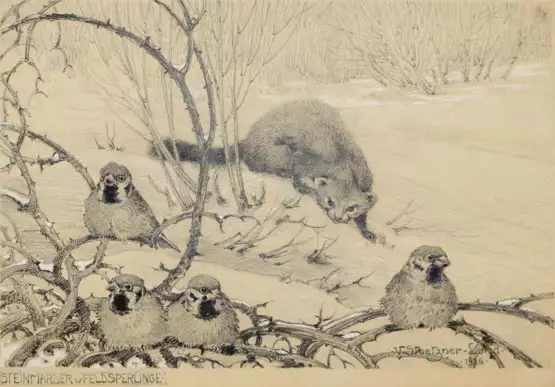 Deutscher Tier- und Landschaftmaler, Illustrator. - Über den Maler Victor Stoetzner-Lund (1883-1947), der nach dem Krieg weitgehend in Vergessenheit geraten ist, ist wenig bekannt. Er lebte in Berlin, wo er wohl zwischen 1924 und 1935 die Hintergründe der großen Tierdioramen am Zoologischen Museum des Museums für Naturkunde malte und dort bis 1944 sein Atelier hatte. Dort befinden sich vermutlich auch noch 4 große Ölgemälde von ihm. Außerdem holte ihn Alexander Koenig an dessen Museum in Bonn. Dort war er ebenfalls für die Gestaltung der Dioramen zuständig, die dort im restaurierten Zustand immer noch zu sehen sind. - Einige seiner unbekannt verbliebenen Gemälde waren in der Zeitschrift Wild und Hund abgebildet.
