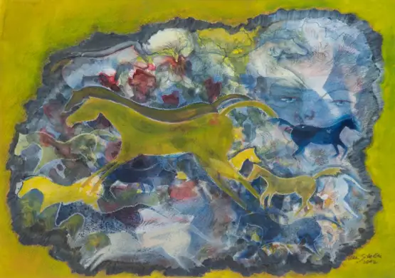 Lot 149 | Stolte, Uta (1938 Hamburg) "Pferde und Gesichter", Mischtechnik, sign. u.r. und dat. 2002, 40x53 cm, im Passepartout hinter Glas und Rahmen
