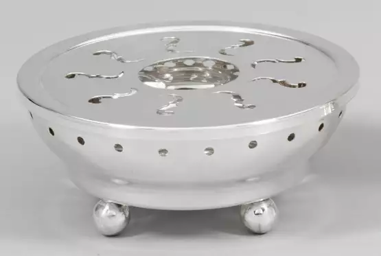Sterlingsilber. Von vier Kugelfüßen getragener, glatter und aufschwingender Korpus mit abnehmbarer, ornamental durchbrochen gearbeiteter Deckplatte. Gest. 925. Gew. ca. 375 g. H. 6,5 cm. D. 15,5 cm.