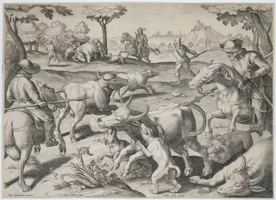 Venationes ferarum.., um 1590. Büffeljagd. Kupferstich nach J.Stradanus bei J.Galle. Qu.4°. Mit d. Namensz., lateinischem Spruch u. Nr. im unt. Plattenrand. Nahezu bis zur Einfassungslinie beschnitten.