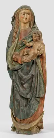 Nussbaumholz, geschnitzt, rücks. abgeflacht und ausgehöhlt, originale Fassung größtenteils übergangen. Maria über der Mondsichel im prononcierten Kontrapost stehend, in beiden Händen das unbekleidete Christuskind in diagonaler Pose darbietend. Die monumentale Ruhe der Muttergottes, der Faltenwurf (insbesondere die Kopftuchlegung) und das Christuskind, lassen zusammen auf eine Datierung um 1480 schließen, als Herkunft wird Süddeutschland oder genauer Schwaben angenommen. Polychrome Fassung größtenteils später überarbeitet, Krone fehlt. H. 68,5 cm.