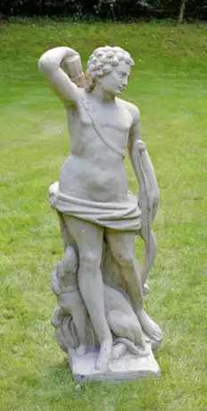 Steinguss. Auf rechteckiger Plinthe die antikisierende Darstellung eines mit Tuchdraperie bekleideten jungen Jägers, einen Pfeil aus dem Köcher auf seinem Rücken ziehend. Zu seinen Füßen sitzend ein Jagdhund, treu zu ihm aufblickend. H. 135 cm.