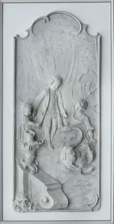 Stuck, teilw. im Relief gearbeitet. Repräsentative Wandvertäfelung für ein Palais aus einer Folge von zumindest drei reliefplastischen Szenen, welche das Leben eines Edelmannes schildern. Diese Tafel zeigt einen Herren mit einem Kind an der Hand, einen Schwan lockend sowie die daneben sitzende Frau. Zwei weitere Gegenstücke (in dieser Auktion) mit Darstellungen des familiären Glücks komplementieren die Folge. Altersspuren. Holzrahmen. Ges. ca. 250 cm x 130 cm. Relief ca. 220 cm x 96 cm.