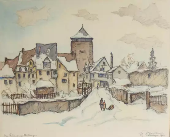 ╔Guido Schreiber╗ (1886-1979). "Am Käferberg Villingen". Aquarellierte Kohlezeichnung 1942. 34,5 x 43 cm. Unt. re. sign., ortsbez. u. dat., unt. li. betitelt. - A. Hässler (19./20. Jh.). ╔Feldberg 1500m Schwarzwald.╗ Öl auf Lwd. 1929. 41 x 50 cm. Unt. li. monogr., verso sign., dat. u. betitelt. Stellenw. Krakelée. - Stellenw. leichte Farbabplatzungen. - ╔Leipzig.╗ ╔Abriß der Churfürstlichen Sächsischen Statt Leyptzig,╗ wie diselbe Jetziger Zeit im Wesen ist. Gesamtansicht aus der Vogelschau mit Legende A-Z, 3-4 unter der Ansicht. Kupferstich v. M.Merian, um 1650. Plgr. 20,5 x 31,7 cm. Unter Passep. - Etw. stockfl., mittig Durchriss, vereinz. Einrisse i. w. Rd.