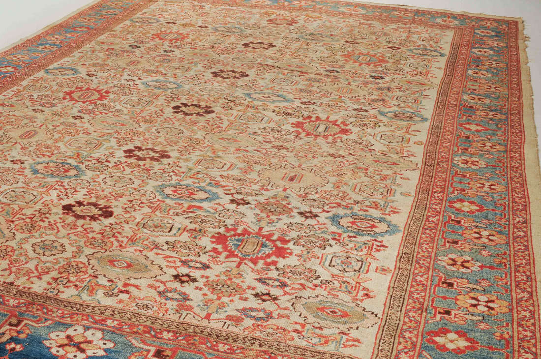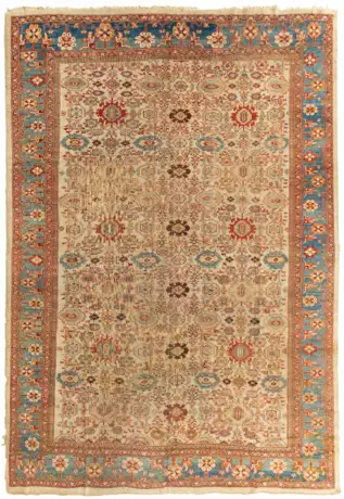 Z-Persien, um 1900. Im elfenbeinfarbenen Feld figuriert flächendeckend ein dekorativ gestreutes und in diagonalen Reihen grosszügig angelegtes Blüten- und Blattranken-Dekor in geschmakvollen Pastellfarben. Mehrere florale Borten umranden stilvoll die hellblaue, wirkungsvolle Hauptbordüre, die mit elegant platzierten Blütenpalmetten belegt ist und einen aparten Rahmen bildet. Natürlicher Abrash. Gebrauchsspuren. 332x425 cm (ft. 11x14).