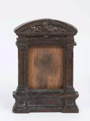 Renaissance-Stil, 19.Jh. Eiche geschnitzt. Im Giebel Gottvater, flankiert von 2 geflügelten Engelsköpfen. H 22 cm.