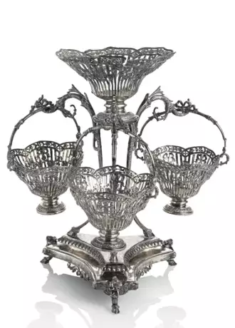 Silber, durchbrochen gearbeitet. Abnehmbare Korbschale und 3 hängende Körbe. Phantasiemarken. Ca. 1510gr. Schale besch.