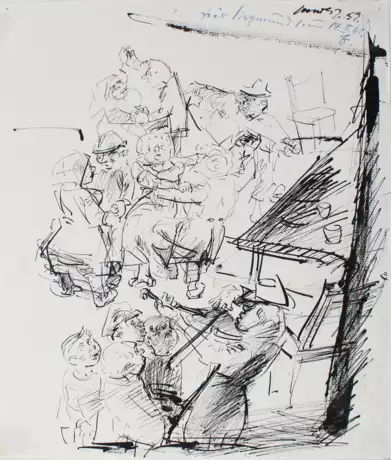 Ein Geiger spielt für tanzende Paare. Tuschzeichnung 1959. Ca. 23,5 x 19,5, Blgr. 24,5 x 21,4 cm. Ob. re. undeutl. sign. u. dat., pers. Widm. dat. 1961. Unter Passep. mont. - Ecken leimfl.