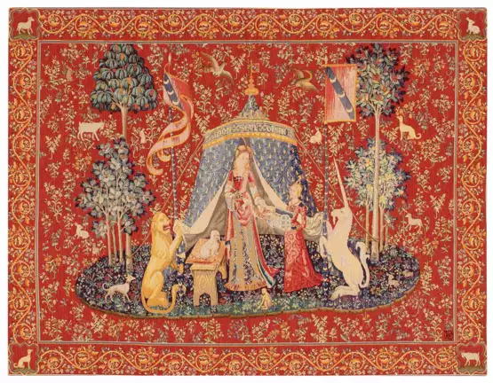 Farbige Wolle, maschinell gewebt und auf Leinen aufgezogen. Über floralem Fond reiche szenische Darstellung der sog. "Jungfrau mit Einhorn" nach einem spätgotischen Vorbild des 15. Jh. im Musée de Cluny in Paris. R. u. Wappenkartusche mit Monogr. "TAL". 190 cm x 145 cm.