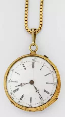 Schweiz, Ende 19. Jh. Gelbgold, gest. 18 k. Guillochiertes Uhrengehäuse mit Monogrammkartusche, weiß emailliertes Zifferblatt (Haarrisse) mit römischen Indexen, arabischer Minuterie und Louis XV-Zeiger. Automatikwerk. Starke Gebrauchsspuren. D. 33 mm. Mit Milanese-Kette. Ges.-Gew. ca. 51,08 g.