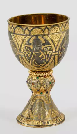A modern partly gold foiled white metal replica of the Tassilo Chalice at Kremsmünster Abbey, Austria.