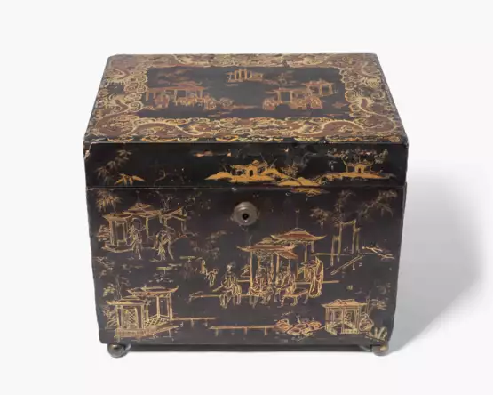 China, Ende 19./Anfang 20.Jh. Schwarzlack mit gemalten figürlichen Szenen in Gold und Dunkelrot. Rechteckige Schatulle mit herausnehmbarer Deckeldose aus Zinn im Inneren. Zwei seitliche Tragegriffe. 24,5x19x20 cm.