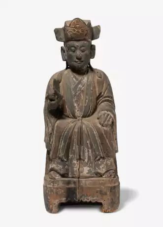 China. Ming-Stil. Holz. Sitzender Würdenträger mit erhobener Rechten. Mit Resten einer farbigen Fassung. H 36 cm. Mit Box.