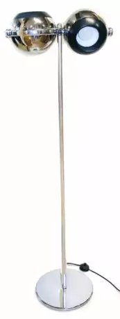 für Erco Leuchten. Space Age Kugellampe mit verstellbaren Lichtquellen. 2 E 27 Fassungen. Chrom u. Kunsstoff. ca. 1970-80. H: 155 cm.