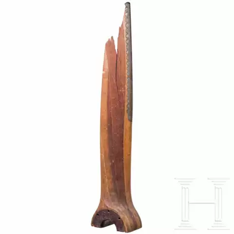 Die Hälfte eines klassischen Propellers aus Schichtholz mit vs. Metallkante, im Lochkreis geteilt, durch Bodenkontakt beschädigt, die Nabe mit seitlicher Nummernstempelung. Höhe ca. 85 cm.