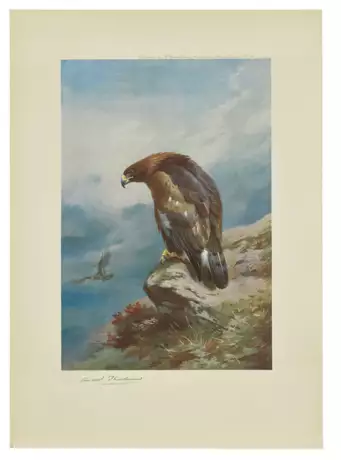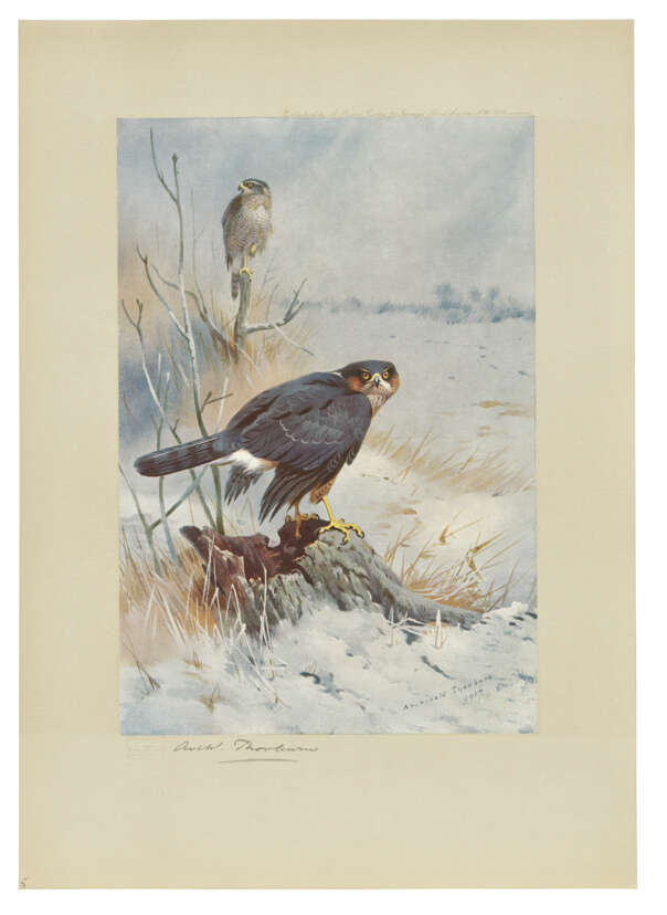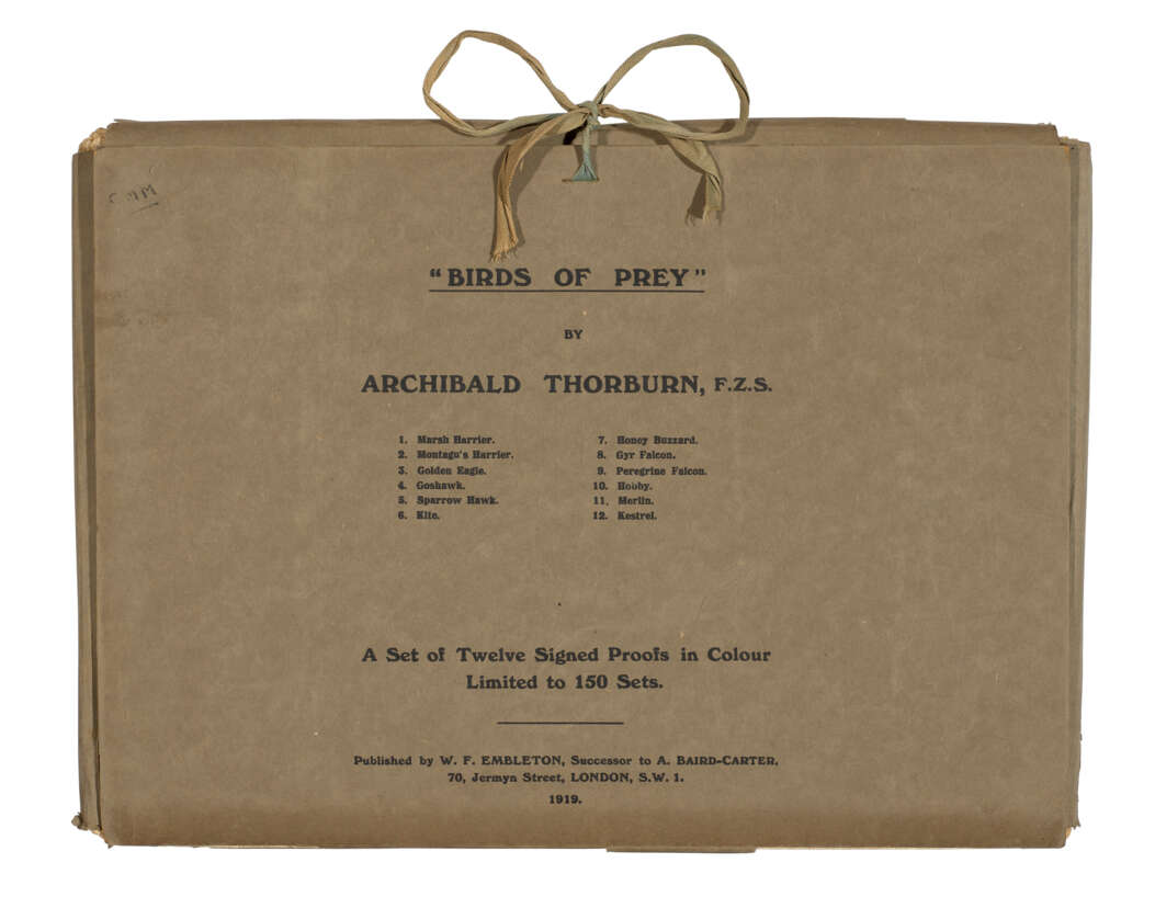 One of only 150 sets of fine colour plates of birds of prey that were not used in any other of Thorburn’s publications. As an ornithological artist, Archibald Thorburn falls between the genres of Victorian sporting artists and 20th century wildlife painters. He has been described as: ‘The master of every aspect of animal art, Thorburn has never been surpassed in the delineation of feathers, conveying the softness of their texture and the delicacy of their markings with a skill which has been the despair of bird artists ever since’ (S. Peter Dance, The Art of Natural History). ‘He painted his subjects outside in their natural surroundings, creating realistic images, … indicative of the struggle for survival’ (Christine Jackson, Dictionary of Bird Artists of the World).