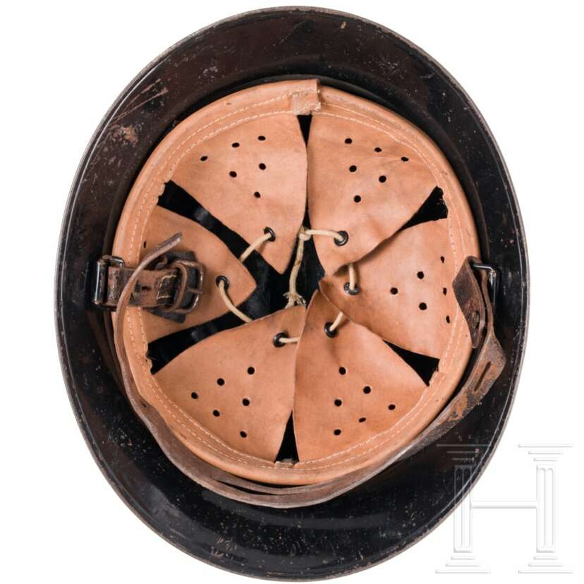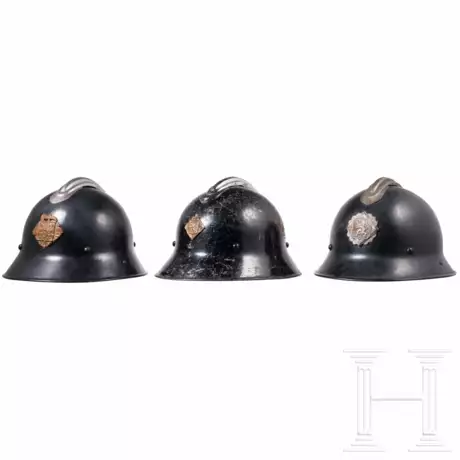 Jeweils schwarz lackierte Eisenglocken mit vernickeltem/blank Kamm und vs. aufgelegtem Emblem. Komplett mit Innenfutter.