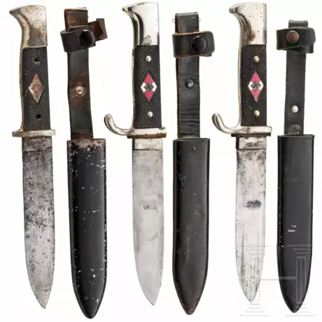 Fahrtenmesser der Hersteller Josef Hack Steyr-Österreich (RZM M7/103), PUMA Solingen (RZM M7/27, 1939) und Artur Schüttelhöfer Solingen (RZM M7/13). Bei einem Fahrtenmesser fehlen die Nieten in den Griffschalen, der Lederhänger ist beschädigt und die Scheide wurde teilweise nachlackiert. Des Weiteren wurde bei einem Messer die Scheide ersetzt, diese nach 1945 gefertigt. Alters- und Gebrauchsspuren.