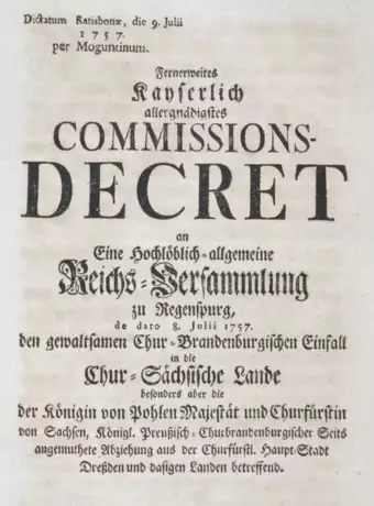 ╔Dabei:╗ (Thurn und Taxis,A.v.). Kayserlich allergnädigstes Commissions-Decret an Eine Hochlöblich-allgemeine Reichs-Versammlung zu Regenspurg, de dato 9. Julii 1757, den gewaltsamen Chur-Brandenburgischen Einfall in die Chur-Maynzische Stadt Erfurth und dasige Lande betreffend. Nebst Beylage. Regensburg, o.Dr. 1757. Kl.4°. 4 Bl. Ohne Einband, ausgebunden. - VD 18, 90243226. - ╔Plotho,E.C.v.╗ Schreiben des Königlich-Preußischen Comitial-Gesandten, Herrn Ehrich Christoph Freyherrn von Plotho an die allgemeine Reichstags-Versammlung zu Regenspurg d. d. 11. Julii 1757. Die Beschwerden der Königl. Preuß. Postämter in den Clevischen und übrigen am Nieder-Rheinisch-Westphälischen Crayse gelegenen Lande betreffend. Nebst Beylagen No. I. & II. O.O.u.Dr. 1757. Kl.4°. 4 Bl. Ohne Einband, ausgebunden. - VD 18, 12462578. - ╔(Karg von Bebenburg,F.C.)╗ An eine Hochlöbliche allgemeine Reichs-Versammlung abgenöthigte Vorstellung der Chur-Cöllnisch- dann Hochfürstlich Paderborn- und Münsterischen Gesandtschafft in Betreff deren In Sr. Churfürstl. Durchl. zu Cölln Hochfürstl. Paderborn- und Münsterischen Landen von denen Chur-Braunschweigischen Trouppen ausgeübten gewaltsamen Thät- und Feindseeligkeiten. Mit beygefügter Specie Facti, und Beylagen a Num. 1. bis 25. Regensburg, o.Dr. 1757. Kl.4°. 39 S. Ohne Einband, ausgebunden. - VD 18, 14763052. - Tls. leicht stockfleckig.