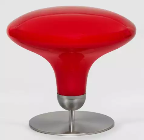1-flg.; Rotes, weiß hinterfangenes Muranoglas und Metall. Über flachem Rundsockel kurzer Schaft als Träger für pilzförmigen, offen gestalteten Korpus. Elektrifiziert. Herstellerzeichen. Entw. Carlo, Nason, 1979. H. 41 cm.